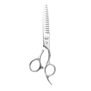 "The Ichiro 16T Texturizing Scissors represent the pinnacle of texturizing and thinning technology, showcasing their prowess through meticulously crafted 16 V-shaped teeth. These scissors truly shine when creating dynamic volume and strategically removing weight from dense hair. While these are undoubtedly their forte, the versatility of these scissors extends to precise point cutting and various advanced texturizing methods. This makes them an indispensable asset for professionals seeking to achieve a diverse range of sophisticated hair textures and cutting-edge styles."
