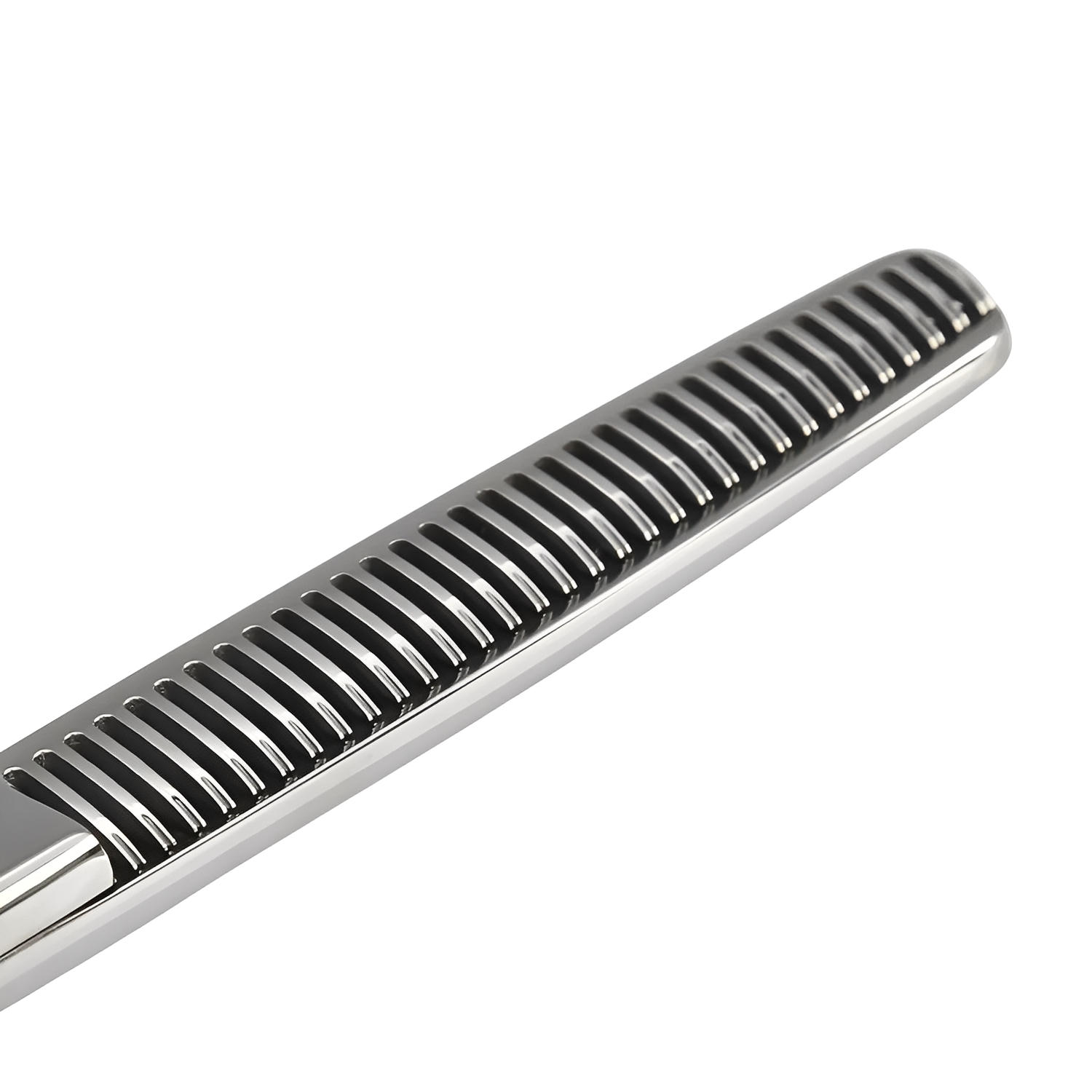These 6.0" professional thinning scissors feature 30 precision-milled V-shaped teeth with an ideal 20-25% cut ratio – the perfect balance for versatile thinning work that removes just enough weight without excessive reduction.