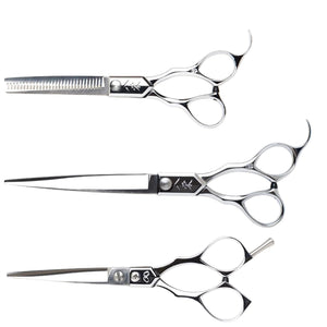 This set includes 2 pairs of Yasaka Barber Cutting Scissors and a pair of Thinning Scissors.