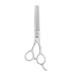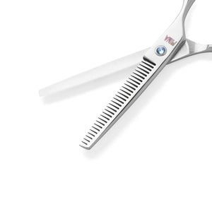 "The Mina Umi Thinning Scissors excel in texturizing and thinning tasks. Their v-shaped teeth are particularly effective for creating smooth, seamless layers and reducing volume in thick hair. These adaptable tools perform well across various cutting techniques, making them indispensable for professional stylists, barbers, and skilled home users seeking salon-quality results."