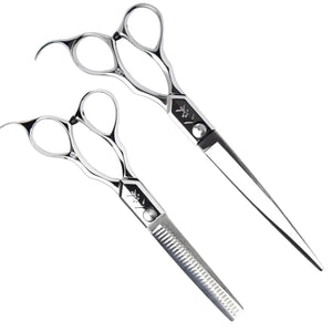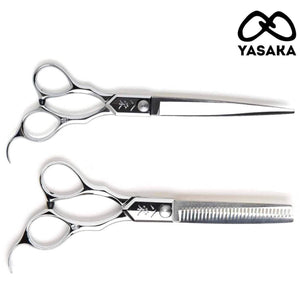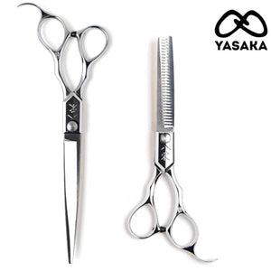 This set includes a pair of Yasaka Professional Barber Hair Cutting Scissors and a pair of Thinning Scissors.